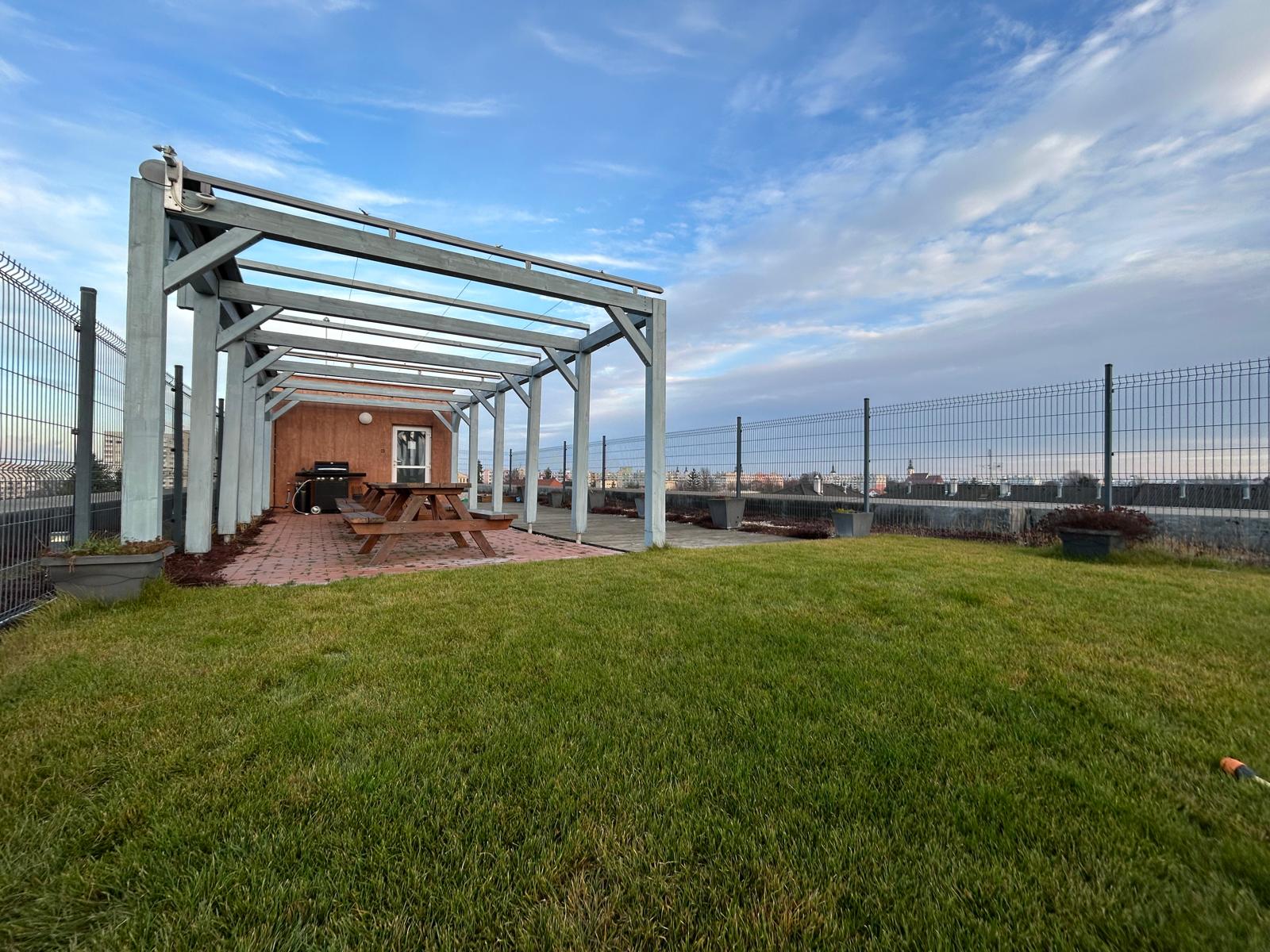 Unikátnou výhodou projektu je zelená strecha, ktorá slúži všetkým obyvateľom na oddych, grilovanie či posedenie s priateľmi. Nájdete tu pergolu s tienením, plynový gril aj priestor na umývanie riadu.