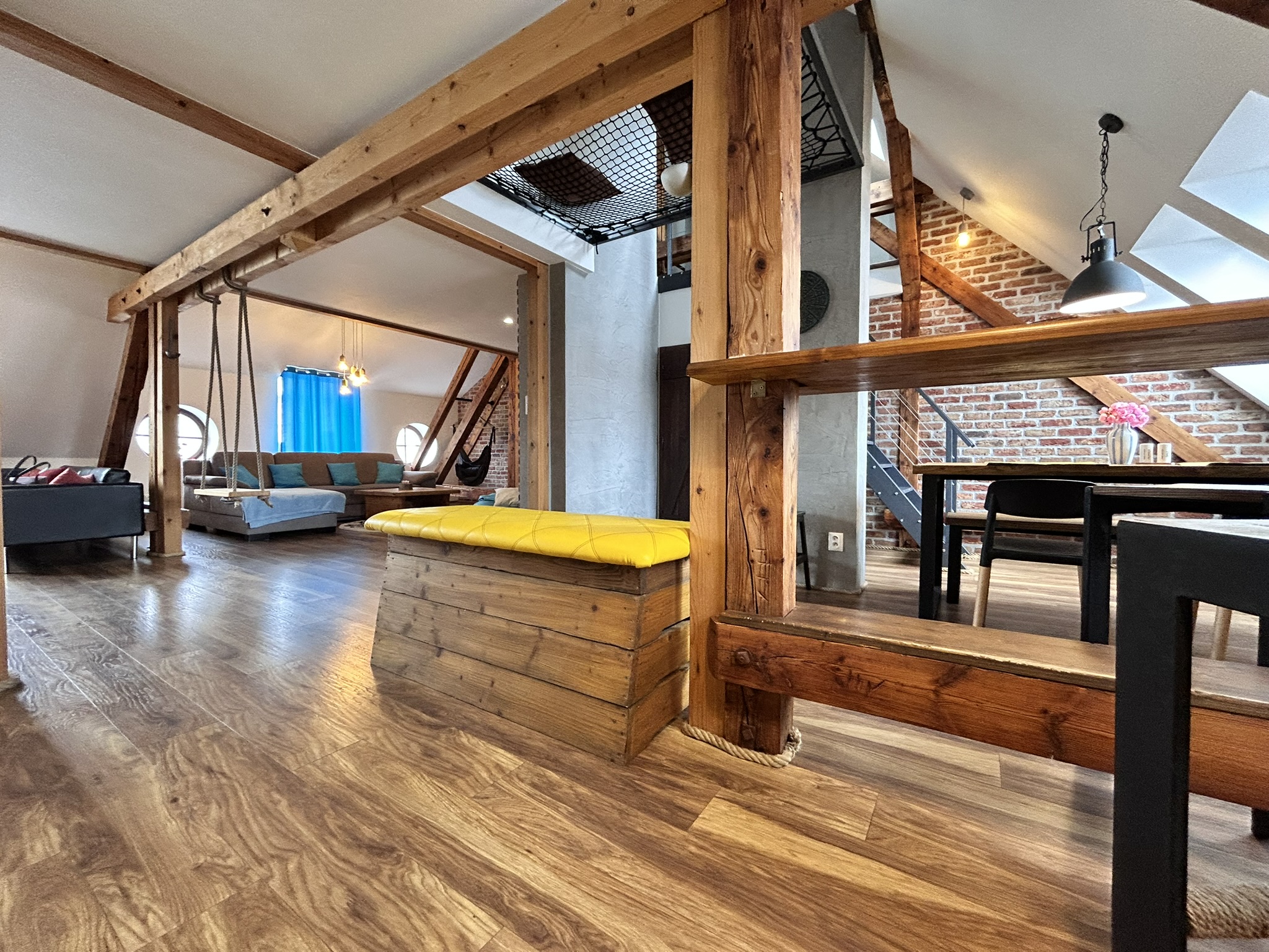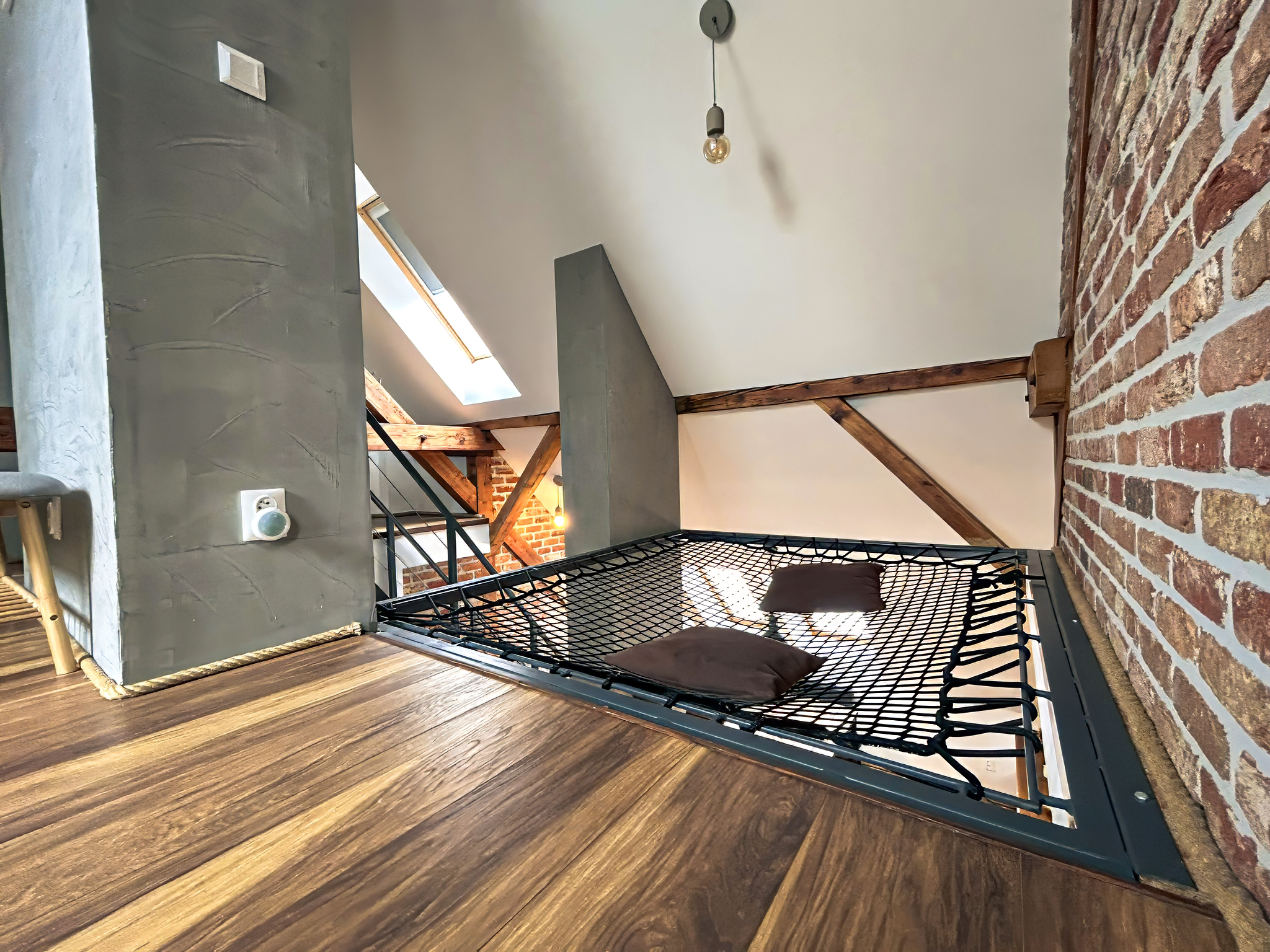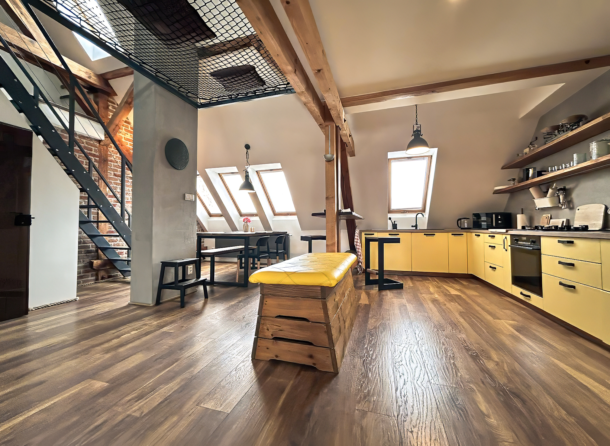 - Kvalitné materiály: Masívne drevené podlahy, priznané tehlové obklady, kovové dizajnové schodisko.