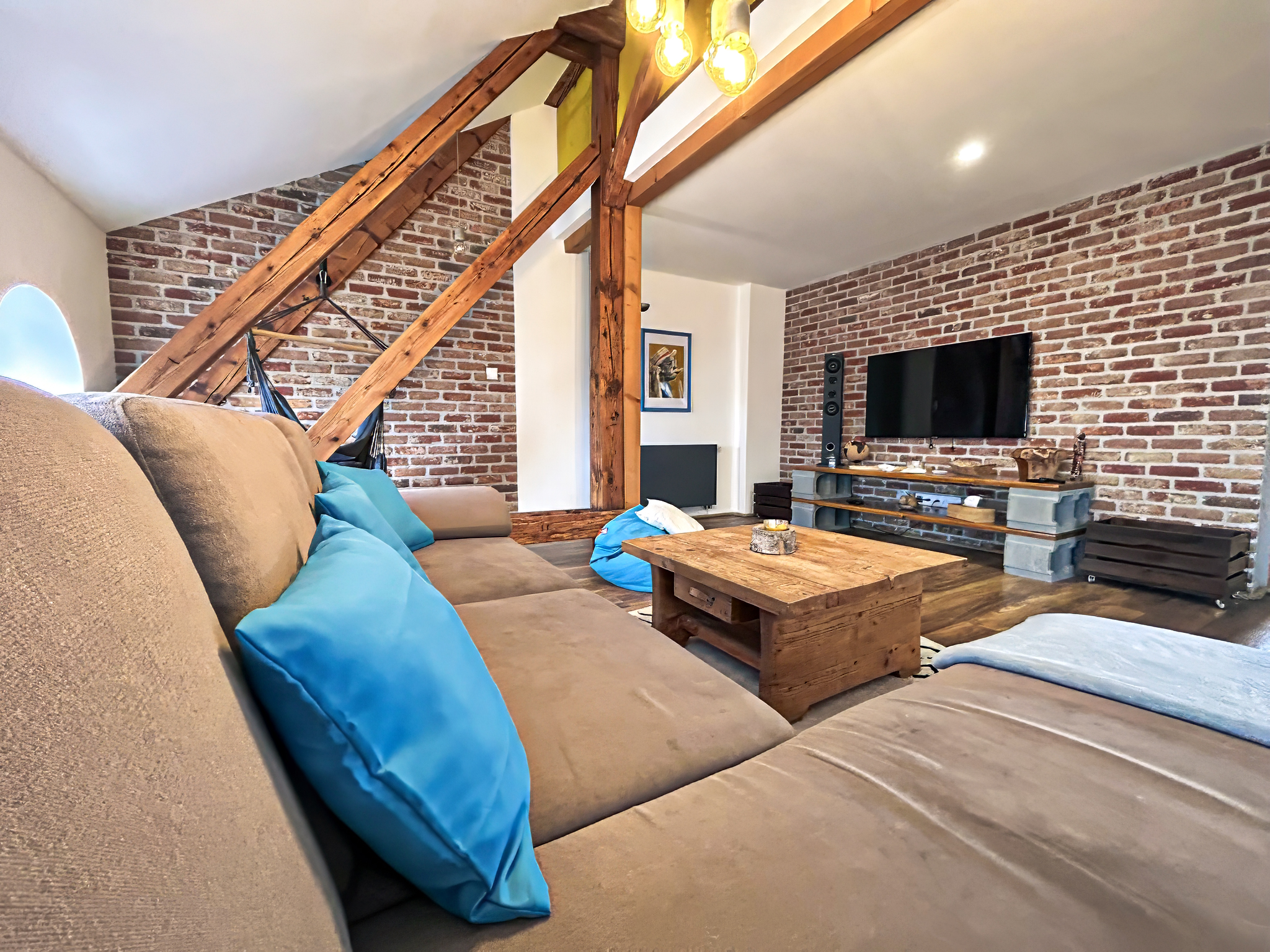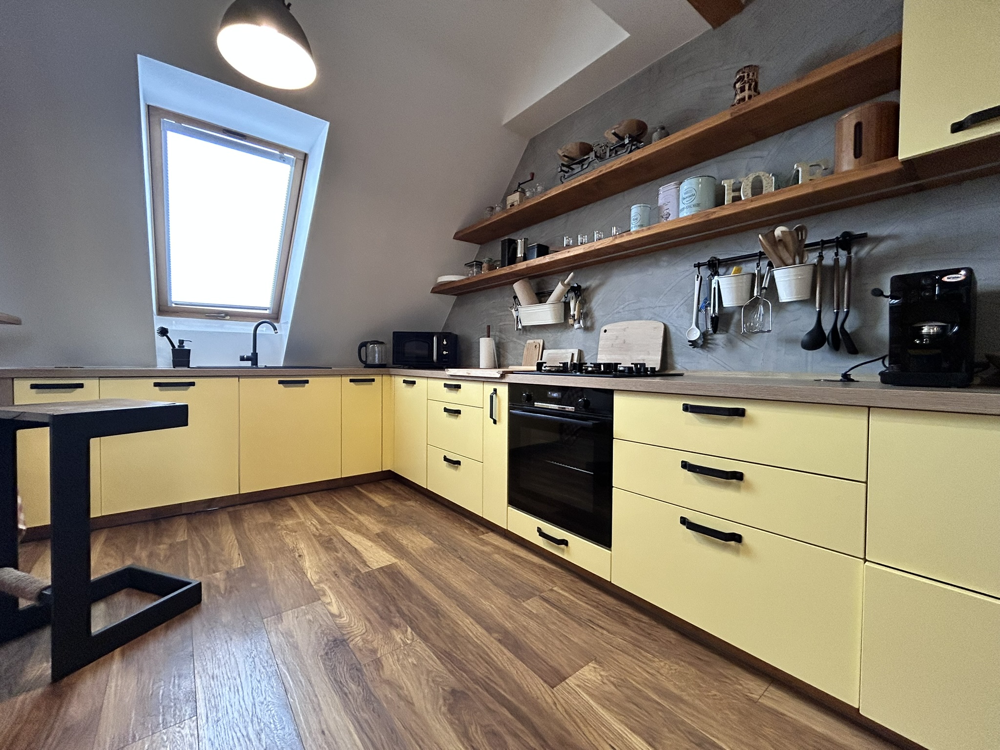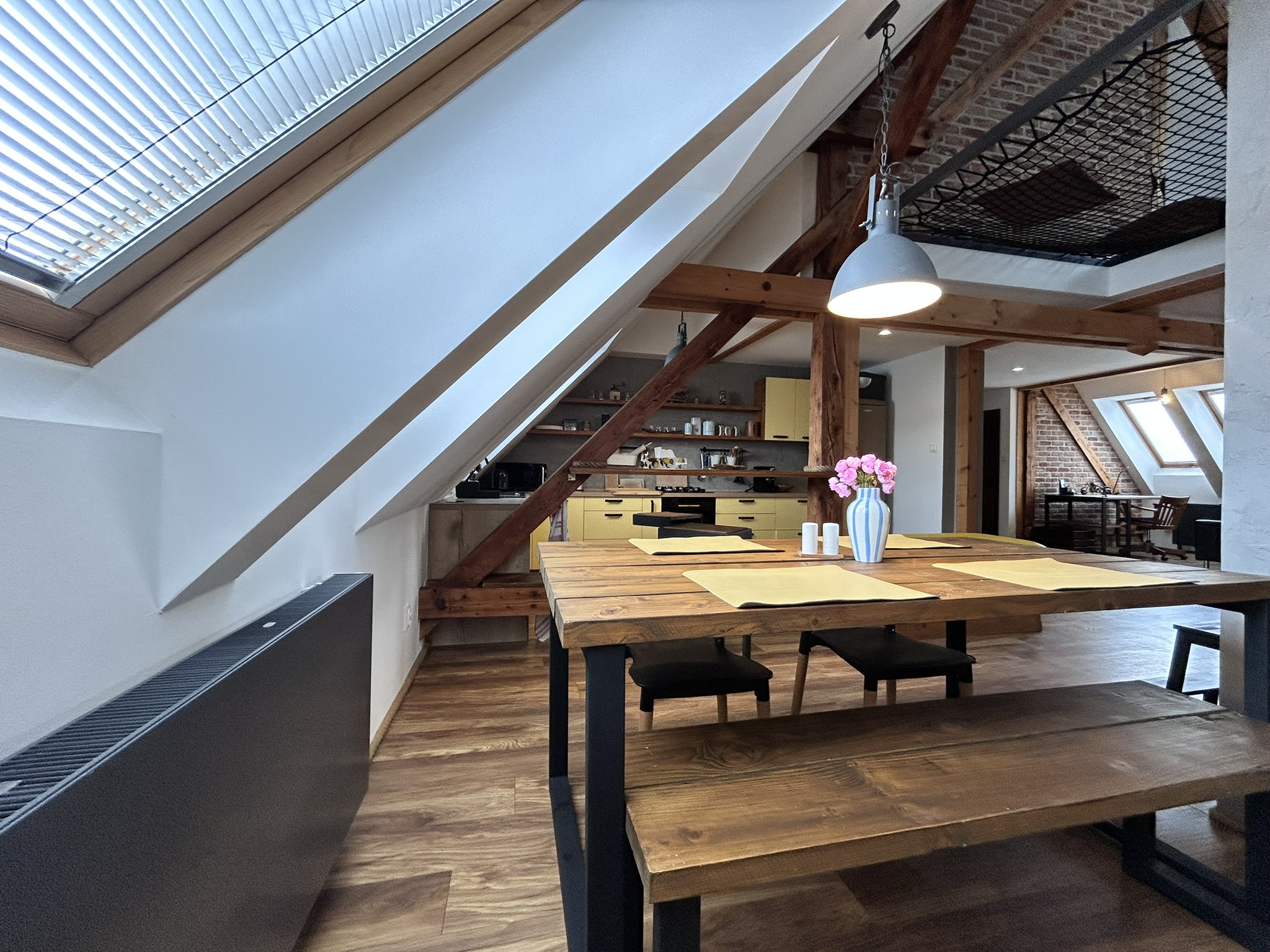 - Kvalitné materiály: Masívne drevené podlahy, priznané tehlové obklady, kovové dizajnové schodisko.