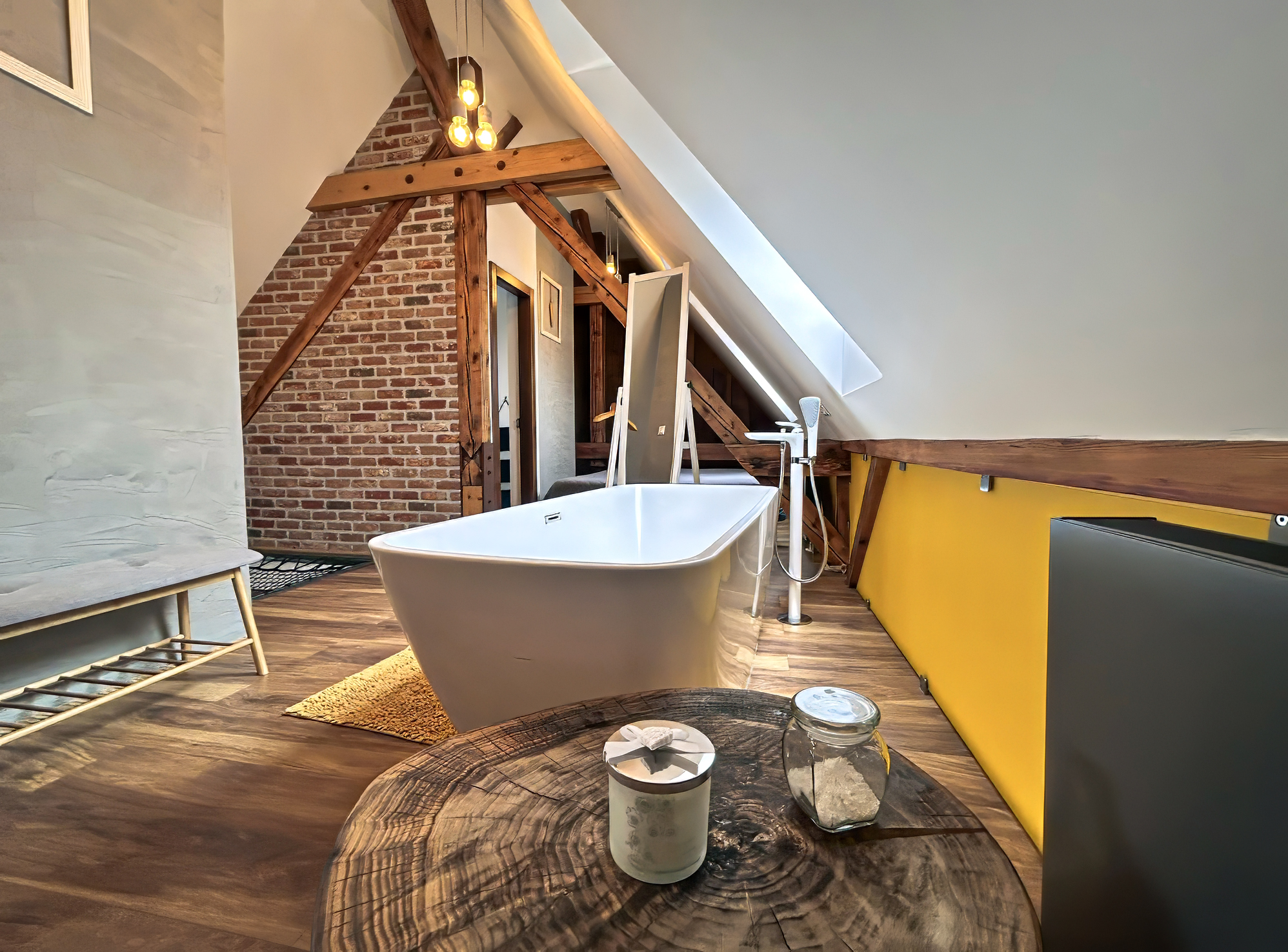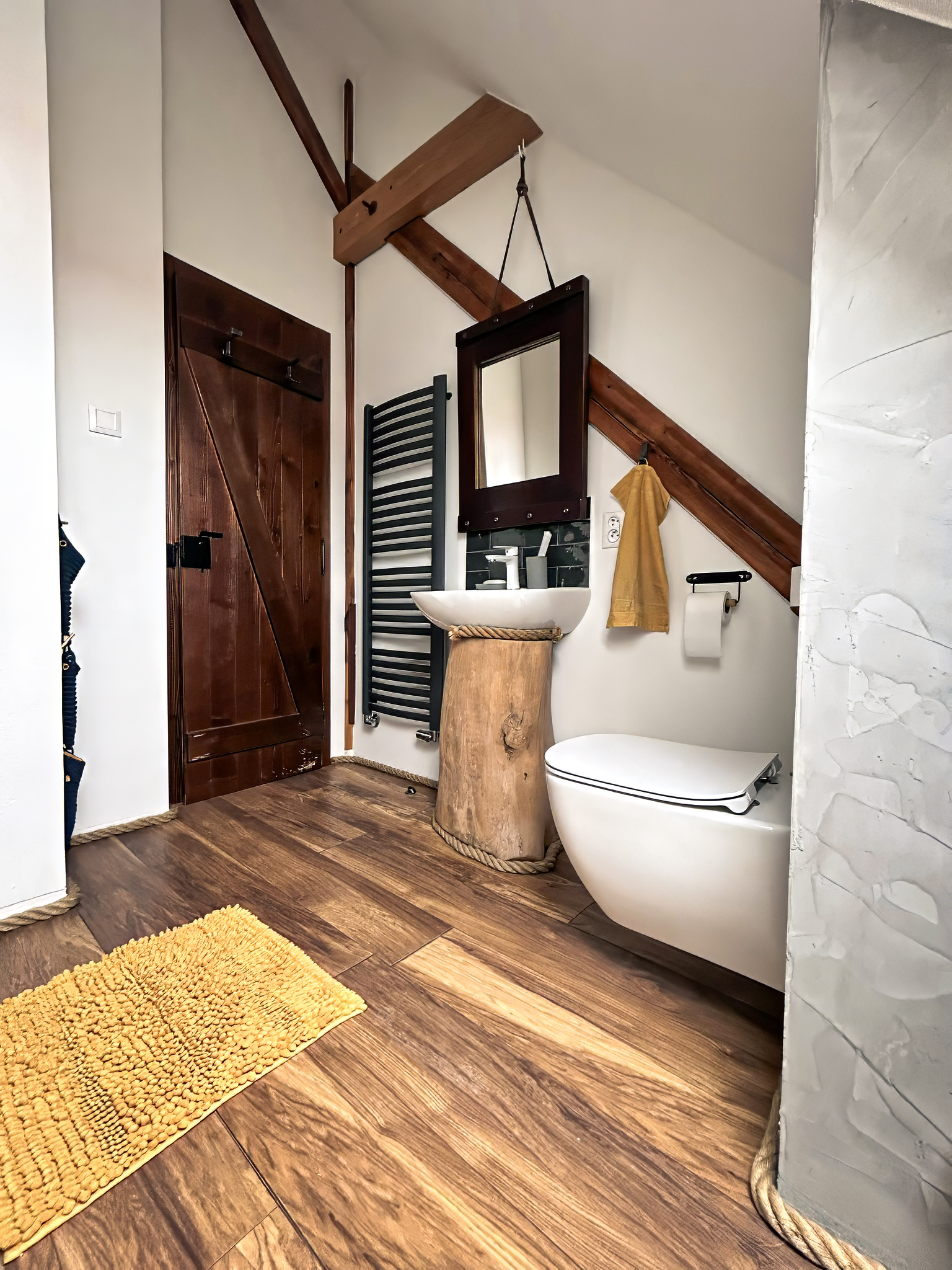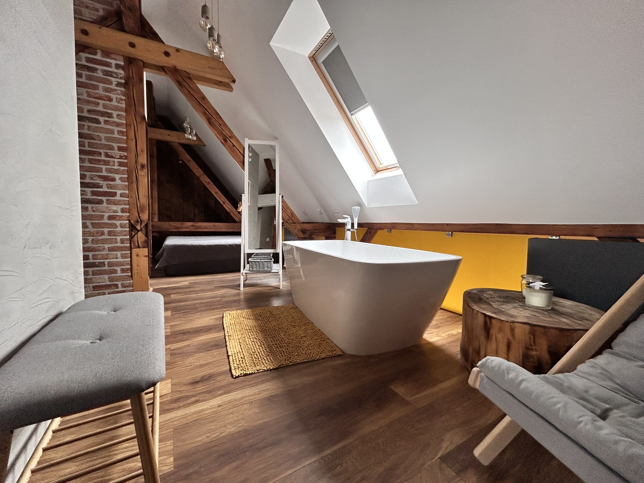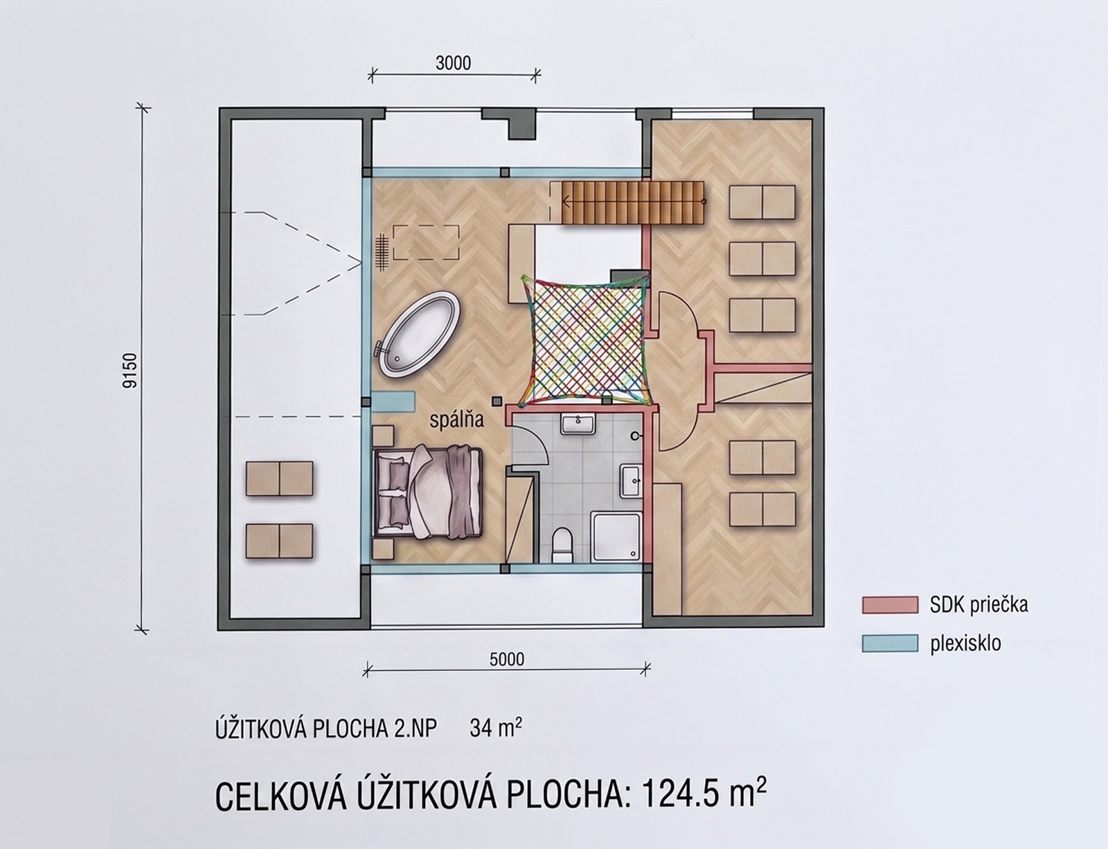 - Nočná a relaxačná oáza (34 m²): Vrchné podlažie je venované oddychu. Dominantou je otvorená spálňa, ktorej stredobodom je voľne stojaca vaňa – ideálne miesto na relax po náročnom dni. Unikátnym prvkom je relaxačná sieť nad obývacou časťou, ktorá podčiarkuje hravosť tohto priestoru. K spálni prislúcha aj druhá kúpeľňa so sprchovým kútom a WC.