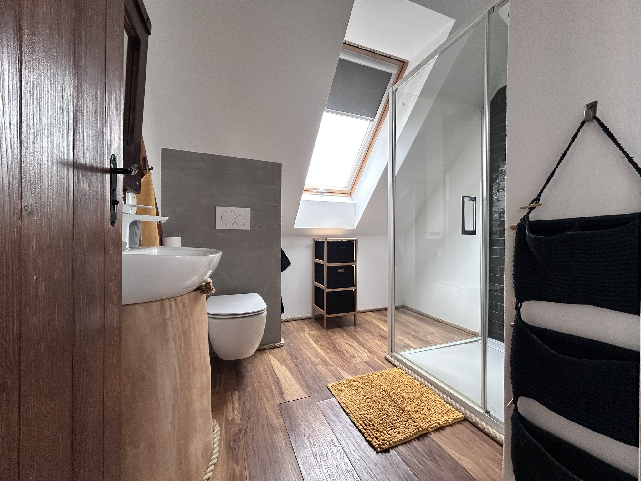 - Komfort: Vlastné kúrenie (plynový kotol), moderná sanita, dizajnové svietidlá.