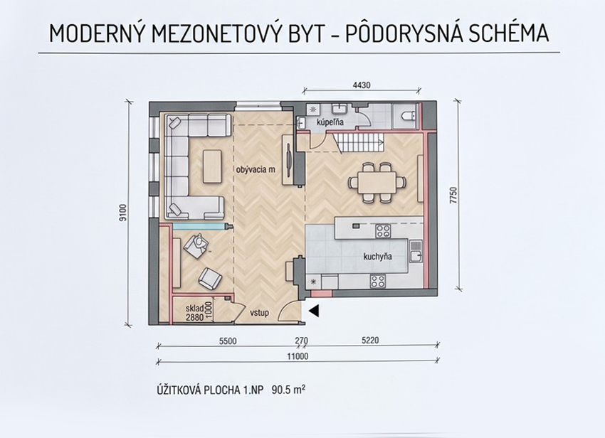 - Denná zóna (90,5 m²): Hneď pri vstupe vás očaria nádherné dubové parkety s klasickým vzorom a vysoké stropy. Srdcom bytu je otvorený priestor spájajúci obývačku s priznanou tehlovou stenou, štýlovú jedáleň a nádhernú kuchyňu, ktorá dopĺňa celý priestor. Nájdete tu aj útulný pracovný kút, kúpeľňu a praktickú technickú miestnosť (sklad).