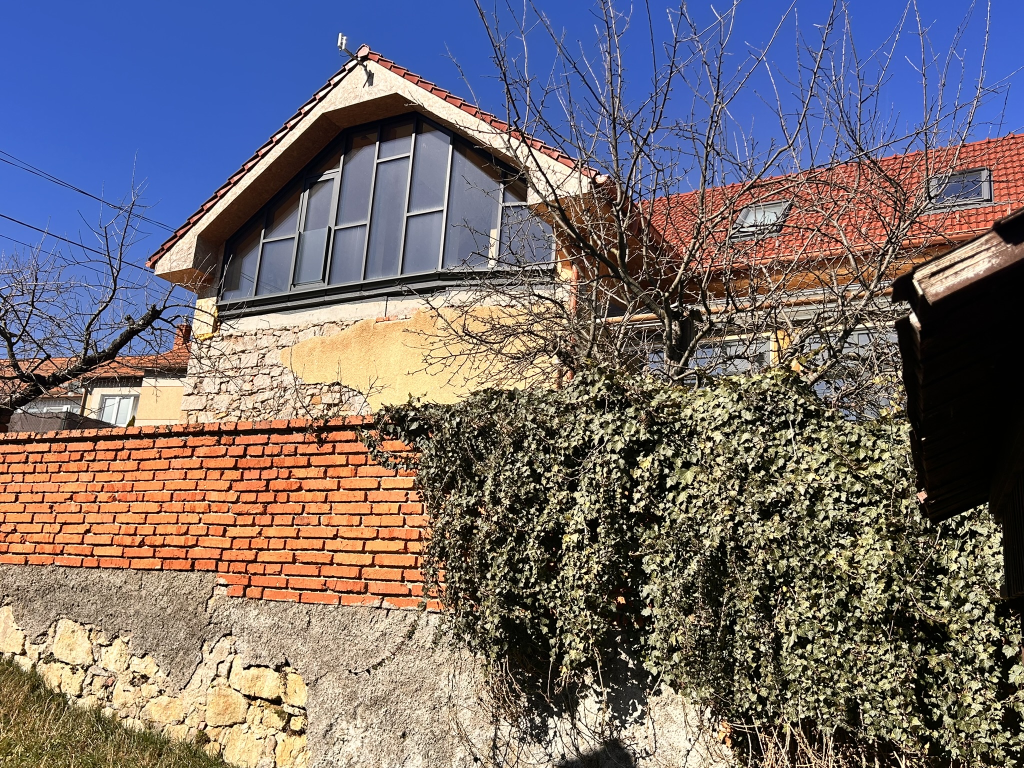 Výrazným architektonickým prvkom domu je veľkoryso presklený štít strechy z hliníkových profilov, ktorý do interiéru prináša množstvo prirodzeného svetla a zároveň otvára krásny výhľad na protiľahlý kopec a časť dediny.